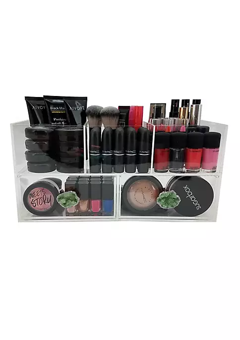 The Andrea is constructed of heavy duty premium grade clear acrylic. It features natural geode stone knobs in 3 optional colors with metallic coated finish for an elegant look. Includes a top tier cosmetic organization station with 3 large compartments for your lipsticks, glosses and much more. Two large bottom pull-out drawers each with their own geode knob.. Perfect for storing jewelry as well. The entire unit measures about 8.9″ x 5.5″ x 6.7″.