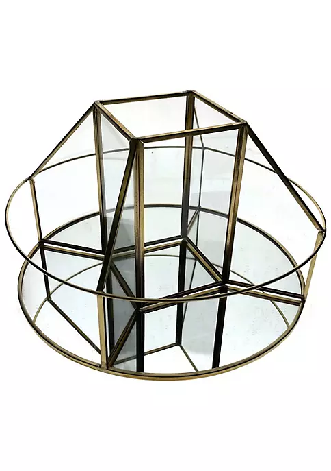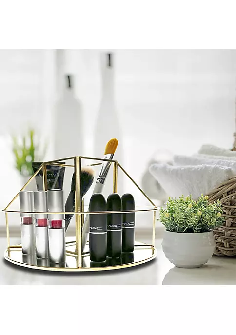 The Gillian Rotating Cosmetic Organizer Tray neatly stores all your makeup in one simple and awesome design. Constructed of a steel frame with mirror base and glass panels, the Gillian Rotating Cosmetic Organizer Tray features a rotating base allowing you to turn and view your cosmetic assortment in 360 degree rotation. Features 4 open storage bins with a tall glass enclosed central bin which is perfect for your brushes, combs and other taller cosmetics. Overall height is 5″. Width is 8″.