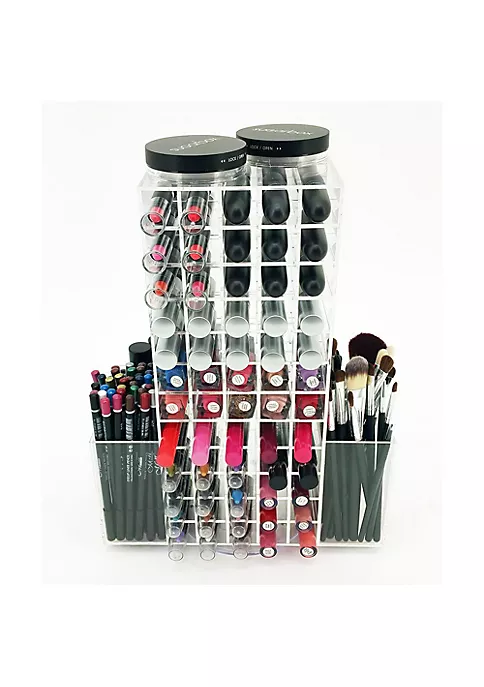 Constructed of heavy duty clear acrylic, the LIP120 Cosmetic Organizer is completely hand assembled and features a rotating base allowing you to turn and view your cosmetic assortment in 360 degree rotation. The center grid column features 35 double sided makeup slots allowing you to place up to 70 lipsticks, lip gloss, mascara, liners, etc. Each of these slots measures 1″ x 1″ x 2.5″ deep. In addition, the center grid has 25 extra long channels at the bottom allowing longer items such as pencils, eye liners, mascara, brushes and more. These 25 slots measure 1″ x 1″ x 5.25″. Alongside the center grid column are two dual bin compartments measuring 2.5″ x 2.25″ x 4.75″ for a total of 4 bins. Overall height is 13.75″. Width is 10.3″ and depth is 5.25″ If using for lipstick alone, this organizer can hold 120 lipstick tubes!. Perfect for the ultimate diva!