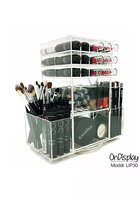 Constructed of heavy duty clear acrylic, the LIP30 Cosmetic Organizer is completely hand assembled and features a rotating base allowing you to turn and view your cosmetic assortment in 360 degree rotation. The center grid column features 15 double sided makeup slots allowing you to place up to 30 lipsticks, lip gloss, mascara, liners, etc. Each of these slots measures 1″ x 1″ x 2.5″ deep. In addition, the center of the unit has 2 pull out drawers at the bottom allowing longer items such as pencils, eye liners, mascara, brushes and more. Alongside the center grid column are two dual bin compartments measuring 2.5″ x 2.25″ x 4.75″ for a total of 4 bins. Overall height is 10.6″. Width is 10.3″ and depth is 5.25″ If using for lipstick alone, this organizer can hold 30 lipstick tubes.. Perfect for the ultimate diva.